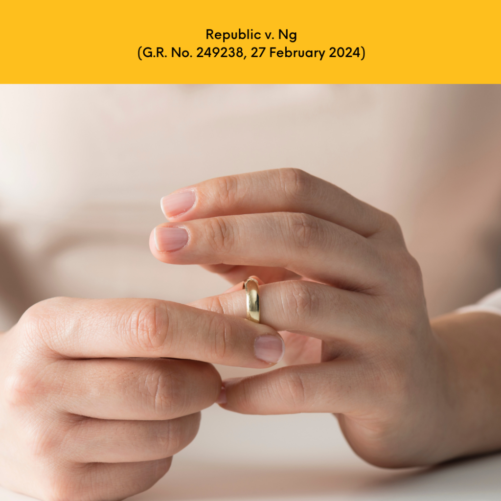 This mode of divorce was the central issue in Republic v. Ng (G.R. No. 249238, 27 February 2024). The Republic argued that the divorce by agreement obtained in Japan by Ruby Ng, a Filipino citizen, and Akihiro Sono, a Japanese national married in Quezon City, should not be recognized in the Philippines. According to the Republic, a foreign divorce, to be recognized here, must be decreed by a court of competent jurisdiction.