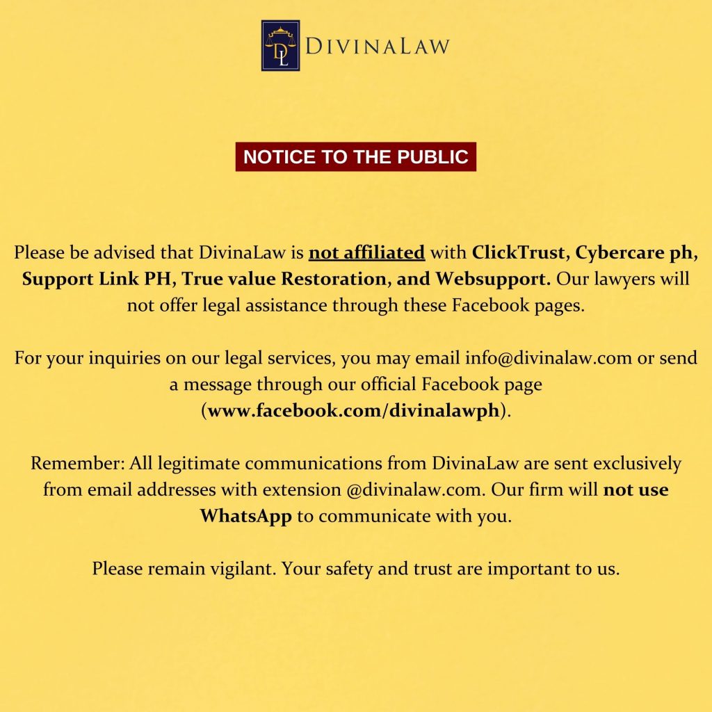 Please be advised that DivinaLaw is not affiliated with ClickTrust, Cybercare ph, Support Link PH, True value Restoration, and Websupport. Our lawyers will not offer legal assistance through these Facebook pages.