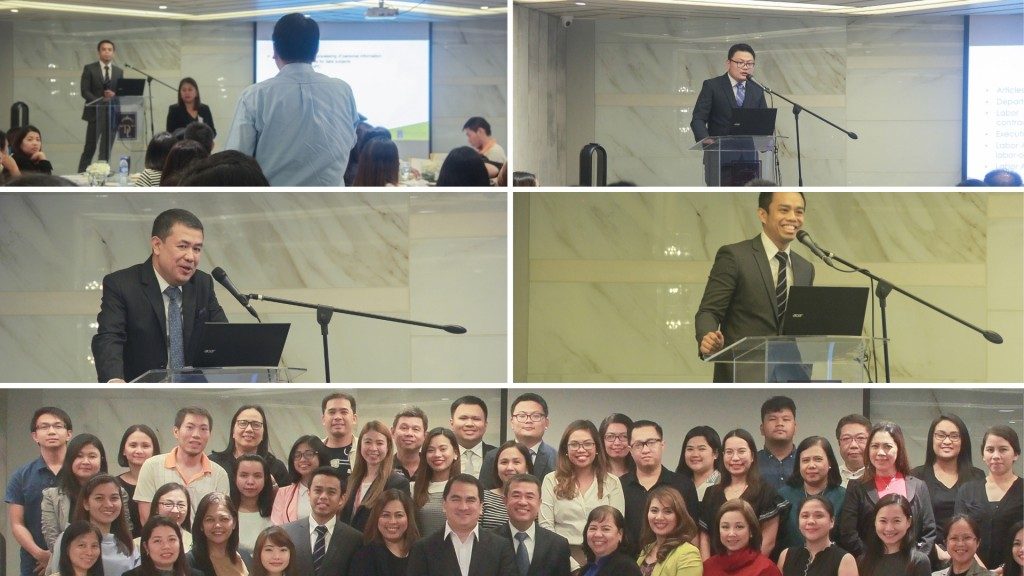 The Firm’s Labor team–composed of Senior Partner Alden Francis C. Gonzales and Senior Associates Ian Jerny de Leon and Ismael Sarangaya, Jr.,–discussed updates on the latest DOLE issuances, the 2018 DOLE handbook, contractualization, employee discipline, labor audit, and the Data Privacy Act for HR practitioners.